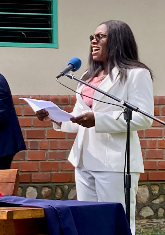 Newly appointed Head Teacher Ms Marvel Mumvwende speaking at the opening of the Lower Primary Centre at Limapela Cedric’s